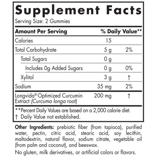 Curcumin is a natural antioxidant derived from the root of the turmeric plant (Curcuma longa) that provides unique antioxidant support. Each 2-gummy serving contains 200 mg Longvida® Optimized Curcumin, which is 285 times better absorbed‡ than other forms of curcumin thanks to patented Solid Lipid Curcumin Particle (SLCP™) technology. Sweetened with xylitol, vegetarian Curcumin Gummies have a great, natural mango taste with zero sugar. Delicious mango-flavored Curcumin Gummies helps promote a health response to inflammation throughout the body.