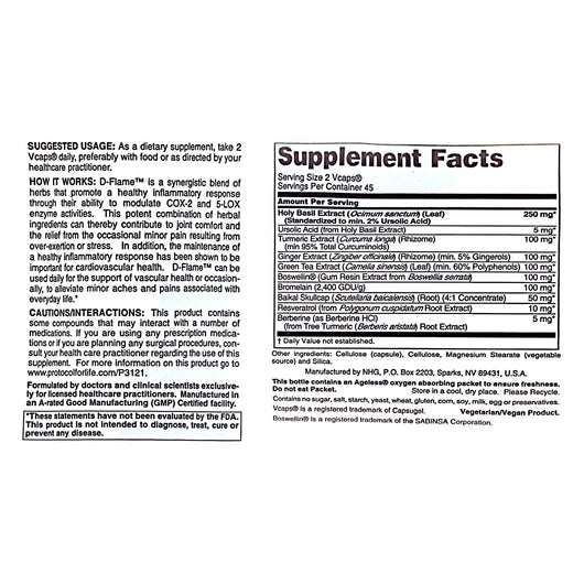 Protocol for Life Balance D-Flame is a synergistic blend of herbs that can reduce the occasional minor pain resulting from over-exertion or stress. * In addition, Protocol for Life Balance D-Flame contains a potent combination of herbal ingredients that contribute to heart health, joint comfort, and balanced inflammatory response. * Protocol for Life Balance D-Flame can be used daily for the support of vascular health or occasionally, to alleviate minor aches and pains associated with everyday life. *