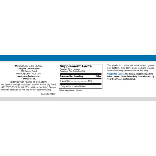 d-Mannose, provided by Douglas Laboratories, supplies 0.9 grams of pure D-Mannose powder per scoop.